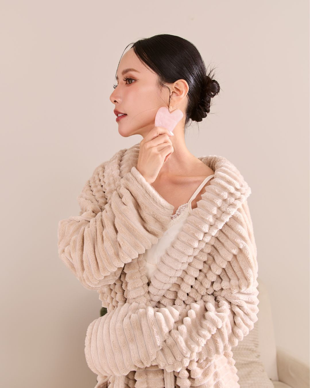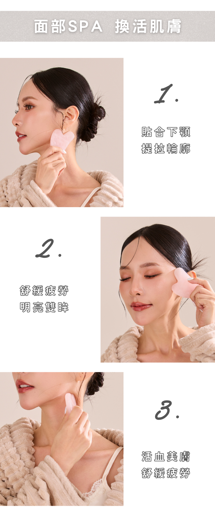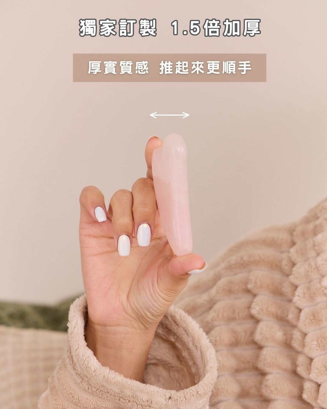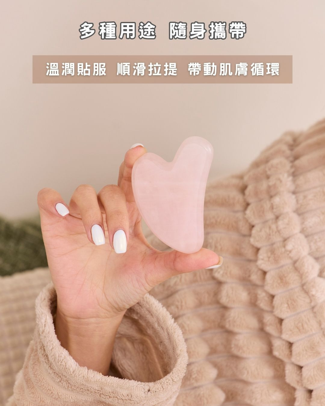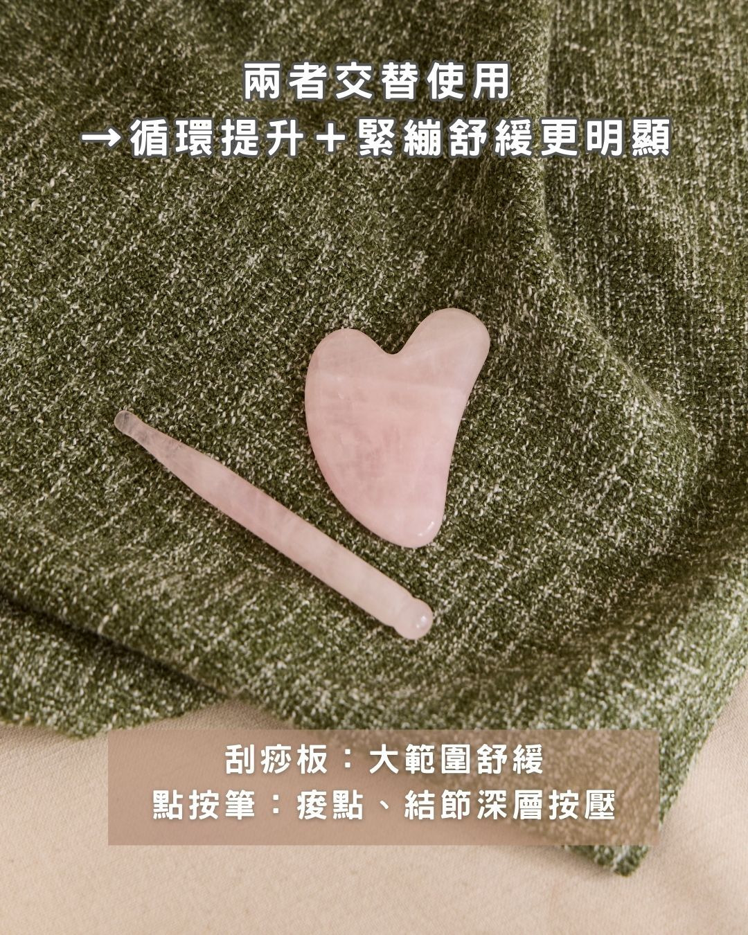 -天然玫瑰石英製成:含有對人體有益的微量元素,能溫和疏通經絡,舒緩疲勞、放鬆緊繃肌膚。